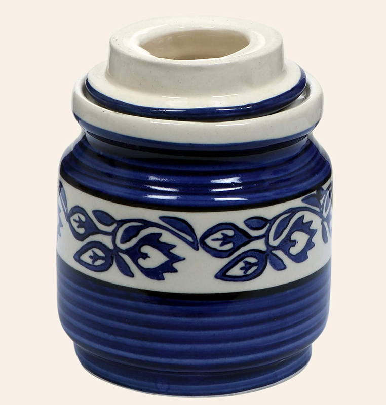 RAJ Royal Hand Painted Ceramic Cornichon Storage Jar for Pickle, Dry items White Pottery Dry Food Storage Container Donga with Lid For Kitchen, Home – Multipurpose Storage Canister (750 g, 1 Piece, Blue)