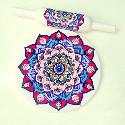KUVI Printed White Marble Roti Maker with Wooden Belan Enamel Print/White Marble Chakla 10 Inch Diameter with Belan (Printed Enamel Chakla Belan) with Stand (Design 22)