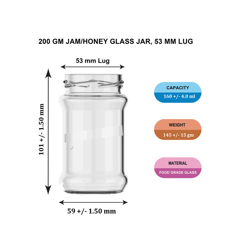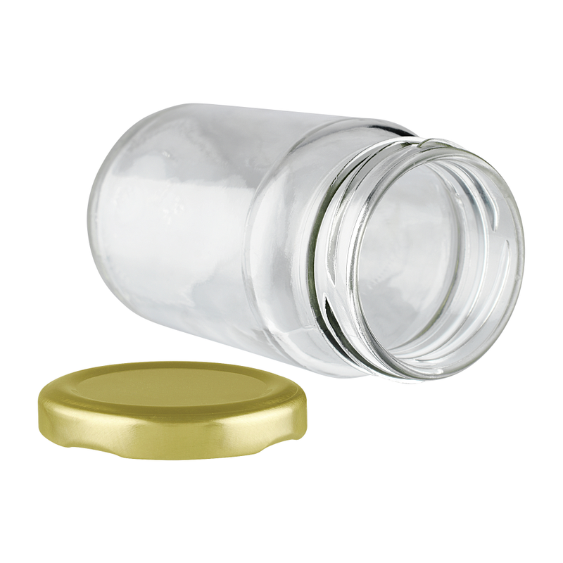 200gm round Glass Jar – Food Grade, 53mm Metal Golden Cap