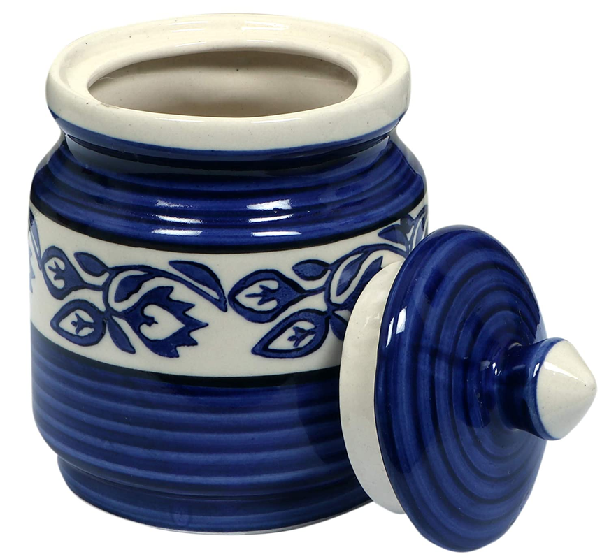 RAJ Royal Hand Painted Ceramic Cornichon Storage Jar for Pickle, Dry items White Pottery Dry Food Storage Container Donga with Lid For Kitchen, Home – Multipurpose Storage Canister (750 g, 1 Piece, Blue)